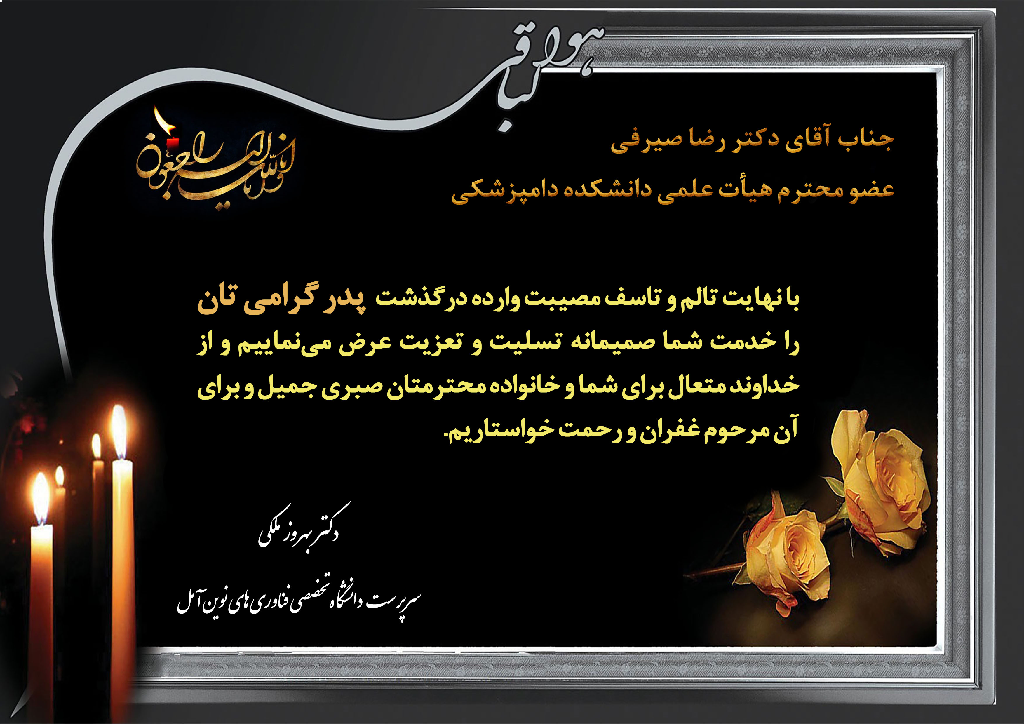 پیام تسلیت سرپرست دانشگاه در پی درگذشت پدر گرامی دکتر رضا صیرفی عضو محترم هیات علمی دانشکده دامپزشکی